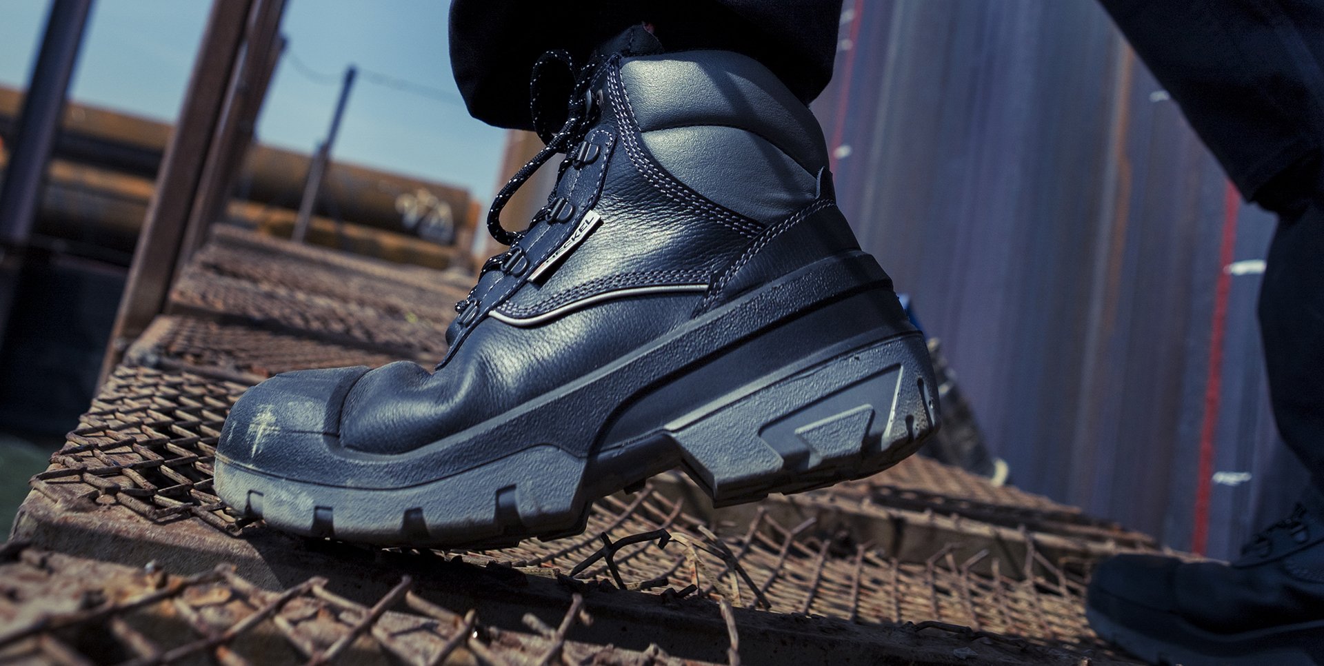 Die extrem schützende Sohle aus doppelt verdichtetem PU, kombiniert mit äußerst abriebfestem Leder, das auch resistent gegen das Eindringen von Flüssigkeiten ist, garantiert den Trägern einen hundertprozentigen Schutz.